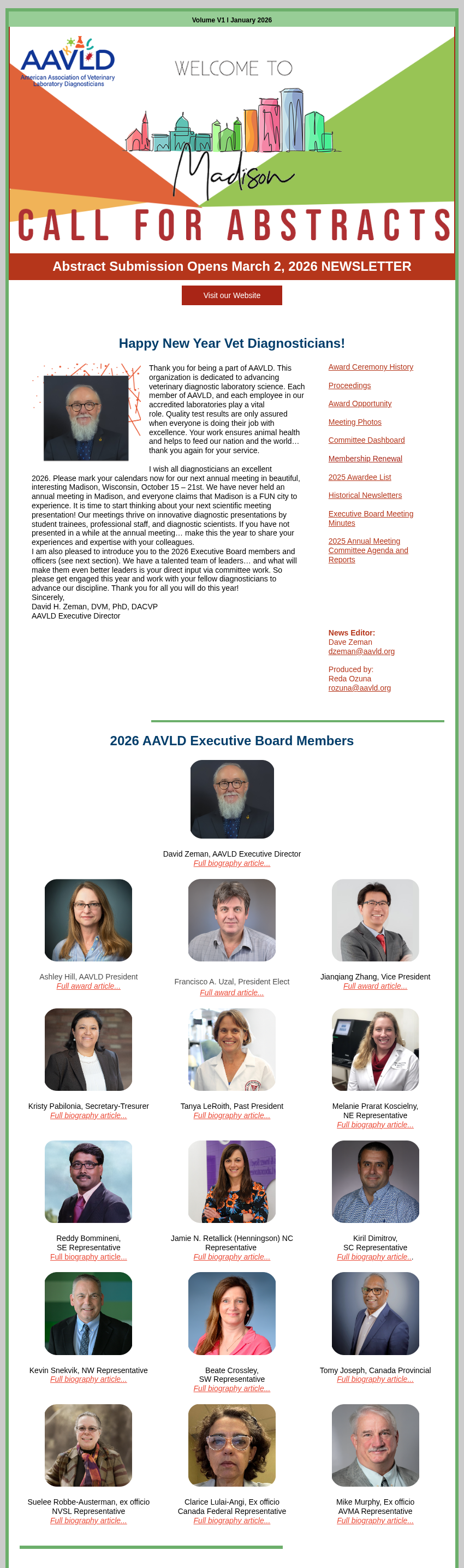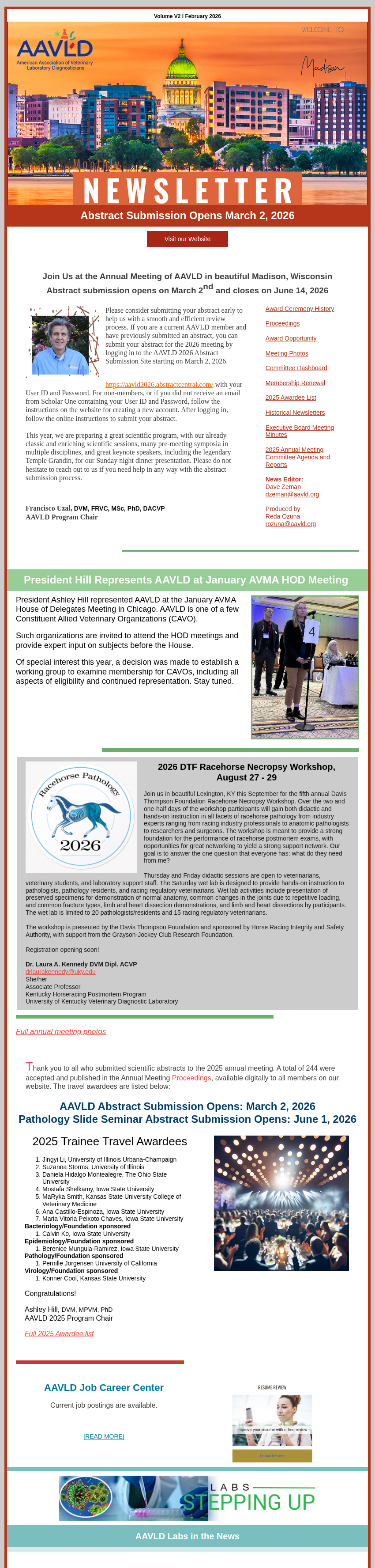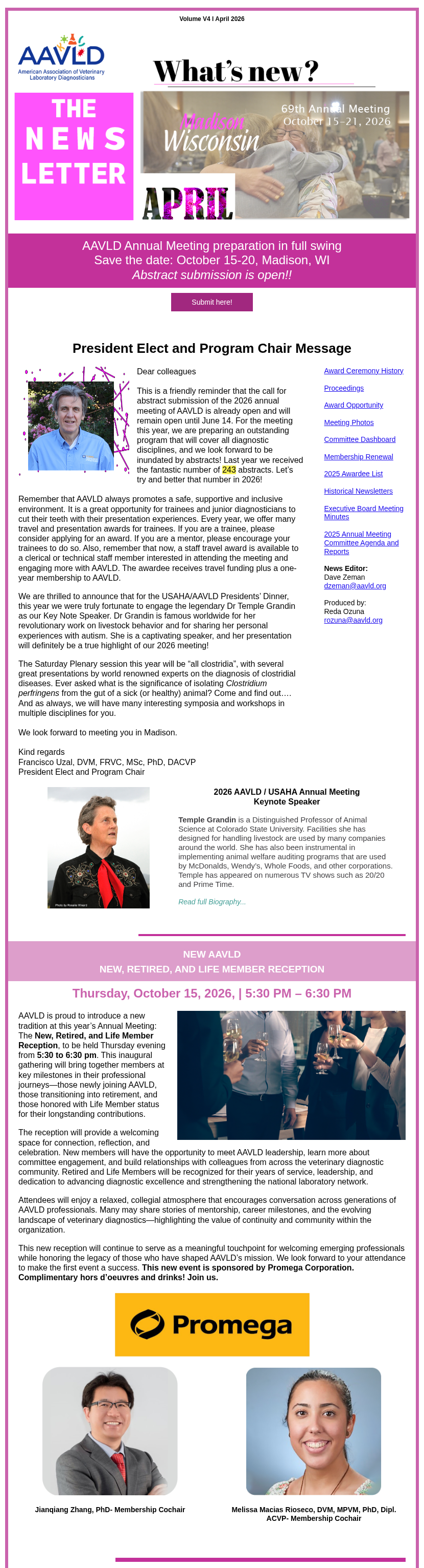 The AAVLD NEWS is distributed by email to all members. For website browsing convenience, a copy of the most recent AAVLD newsletter is below. To download a hot copy with active links, Click hereA complete set of Proceedings of the AAVLD (including those that were a part of USLSA proceedings from 1958-1974) has been delivered to the Manuscript Collection under American Archive of Veterinary Medicine in the Parks Library at Iowa State University in the mid 80’s as per recommendation of the AAVLD Board of Governors (future HOD) in 1984.